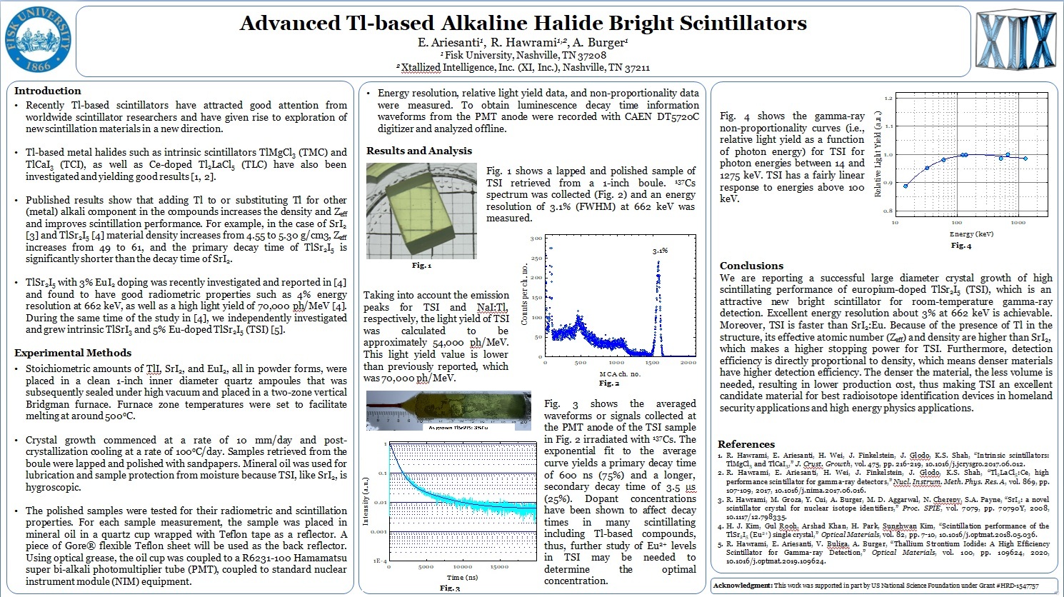 - Characterization of Tl2NaYCl6:Ce Scintillation Crystals as Gamma-Ray Detectors. R. Hawrami, E. Ariesanti, A. Burger, J. Cryst. Growth (2020) 126150.